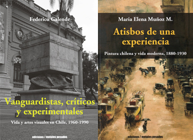 Atisbos de una experiencia: Pintura chilena y vida moderna 1880-1930 escrito por la prof. María Elena Muñoz y editado también por Metales Pesados, “es un conjunto de textos historiográfico-críticos desarrollados a partir de un grupo selecto de pinturas”, señala la autora. La particularidad del libro es que cada texto revisa de manera acuciosa una o dos pinturas relacionadas, proponiendo una lectura fundada sobre el aspecto de la experiencia moderna que ofrecen y sobre los modos en que esta experiencia se traduce en pintura.