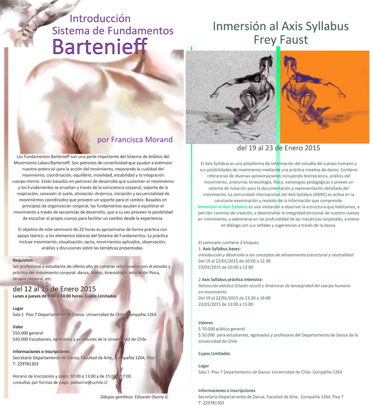 El primero tratará sobre la técnica Bartenieff, cuyos fundamentos están relacionados con el potencial de movimiento del cuerpo a través de la conciencia corporal, el soporte de la respiración, la conexión con el suelo, entre otras herramientas. El seminario se realizará entre el lunes 12 y jueves 15 de enero y tiene un costo de $50.000 para público general y $40.000 para estudiantes, egresados y profesores de la Universidad de Chile.