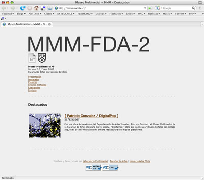 De esta forma, obras de importantes artistas en la historia del arte electrónico y del arte por internet se reúnen en el Museo Multimedial de la Facultad de Artes. A trabajos de Jodi, los italianos 0100101110101101.ORG, Alexei Shulgin, Olia Lialina, Vuk Cosic, entre muchos otros, se puede acceder, simplemente, presionando el botón izquierdo del mouse. Pero la gracia de este Museo radica en que se actualiza constantemente, sumando a su importante colección los trabajos de artistas chilenos que se han atrevido a incursionar en el arte electrónico. Así, el Museo Multimedial posee las primeras obras de este tipo que se hicieron en Chile -de Loyola Records-, así como una de Gonzalo Díaz (una interpretación de una obra que presentó en Kassel en versión para web), de Jorge Gaete, de Gonzalo Geraldo, entre otras, como la recién incorporada obra de Patricio González.