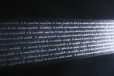Este ciclo de exposiciones cierra con Santa Escritura de Catalina Olivares, proyecto que surgió tras la lectura del libro "El Padre Mío", de Diamela Eltit. Así, una de las citas de esa historia -"La saturación de prendas era correspondiente a la carnalidad maquillada de tierra, formando la costra de una asentada suciedad (...)"- se transformó en el factor fundamental de esta obra que se traduce en una instalación con proyecciones de luz que se exhibirá en la Sala Juan Egenau a partir del próximo lunes 11 de abril.