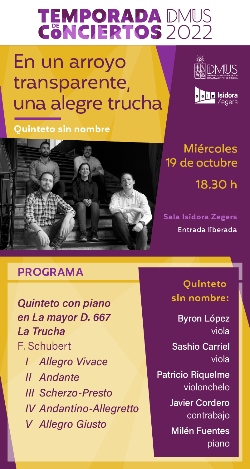 Los responsables de la propuesta serán el Quinteto sin nombre, compuesto por Byron López (viola), Sashio Carriel (viola), Patricio Riquelme (violonchelo), Javier Cordero (contrabajo) y Milén Fuentes (piano).
