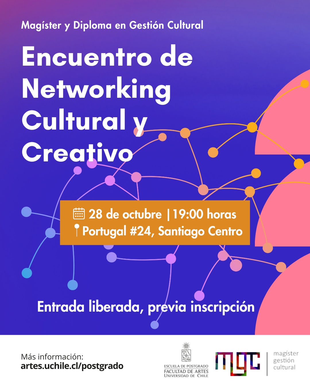 El próximo 28 de octubre, a las 19:00 horas, se realizará esta instancia de networking cultural y creativo, un espacio diseñado para fortalecer la creación de redes, compartir experiencias y fomentar el intercambio entre la comunidad egresada del Magíster y Diploma de Postítulo en Gestión Cultural de la Facultad de Artes.
