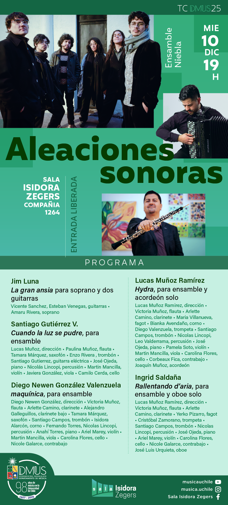 El Colectivo Niebla, integrado por estudiantes de composición e interpretación del Departamento de Música de la Universidad de Chile, presentará el miércoles 10 su concierto "Aleaciones sonoras".
