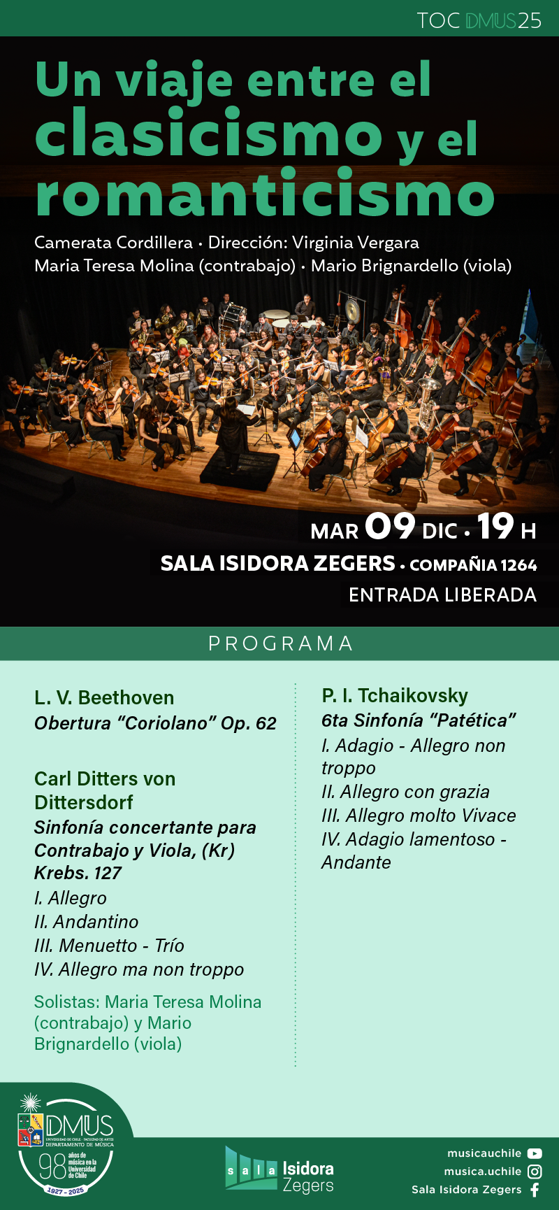 Luego de la obertura "Coriolano" de LV.Beethoven el concierto se centra en la Sinfonía concertante para contrabajo y viola, de Carl Ditters von Dittersdorf que contará con la participación solista de María Teresa Molina en contrabajo y Mario Brignardello en viola como parte de "una obra que ejemplifica la elegancia y el equilibrio del período clásico. Dittersdorf, contemporáneo de Mozart y Haydn, ofrece una pieza en la que los instrumentos dialogan en una interacción virtuosa y expresiva".