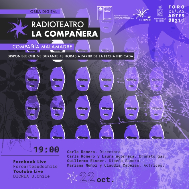 El radioteatro La Compañera, con la dirección de Carla Romero, se transmitirá el 22 de octubre, a las 19:00 horas. En éste se presenta a dos niñas que deben disertar en la escuela sobre un héroe de la patria. Una de ellas decide hacerlo sobre su madre: Cecilia Magni, la Comandante Tamara, militante del Frente Patriótico Manuel Rodríguez. Lo familiar y lo íntimo se mezclan con la historia oficial. ¿Qué hacer con lo personal? ¿Qué historia queremos escuchar? ¿Quién es el otro? son parte de las interrogantes que plantea esta obra de las dramaturgas Carla Romero y Laura Agorreca.