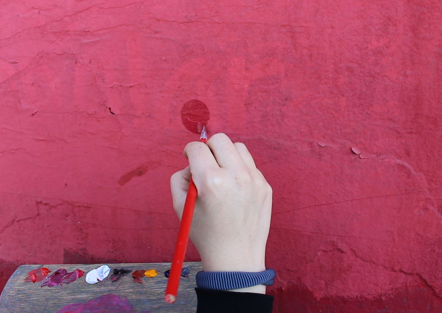 Luego de la observación Daniela Diaz va en busca de los “parches” y realiza pruebas cromáticas que le permitieran dar con el color y matiz del muro que está detrás: “De forma romántica y como un pintor viajero, cargo mi maleta de óleos y en completa calma me sitúo frente a estos muros como lo haría un restaurador frente a un cuadro, preparando mezclas que me permitan llegar al color exacto del muro. Materializándose en una intervención mínima, casi imperceptible, en un punto de color ubicado sobre el parche”, señala.