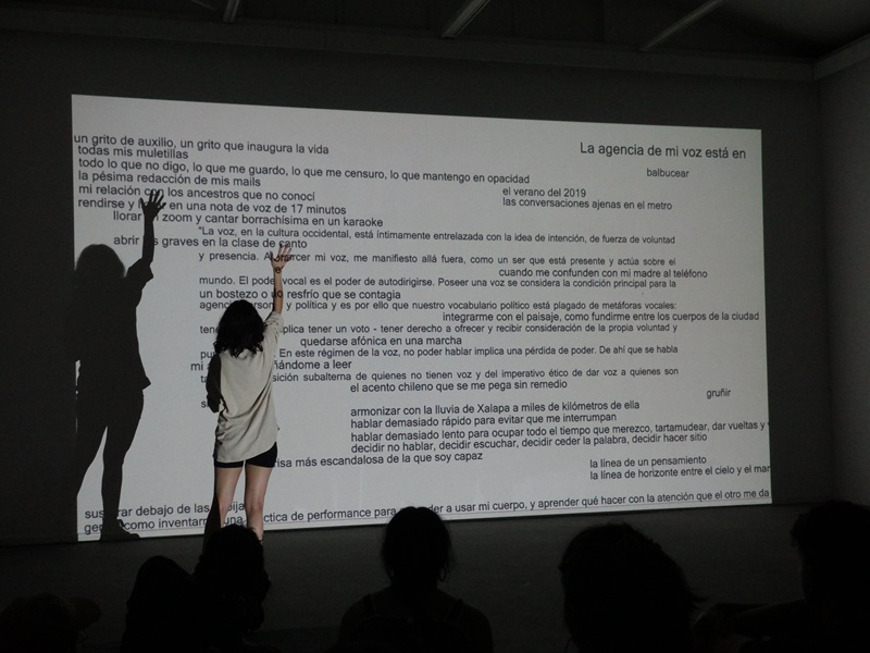 Durante el primer período de exposición se presentó Inmersión vocal, proyecto de investigación-creación de la estudiante Paola Medina, que explora teórica y performáticamente la voz. “En este proyecto se abordan los tres ejes conceptuales que guían la inmersión vocal: corporalidad, singularidad vinculante y agencia, obtenidos desde mis propias exploraciones con la voz y de referentes claves de la filosofía como Adriana Cavarero, Brandon LaBelle y Mladen Dolar”, explicó la estudiante acerca de este proyecto AFE, en que la voz encuentra en la performance nuevas potencias corporales, poéticas y afectivas.