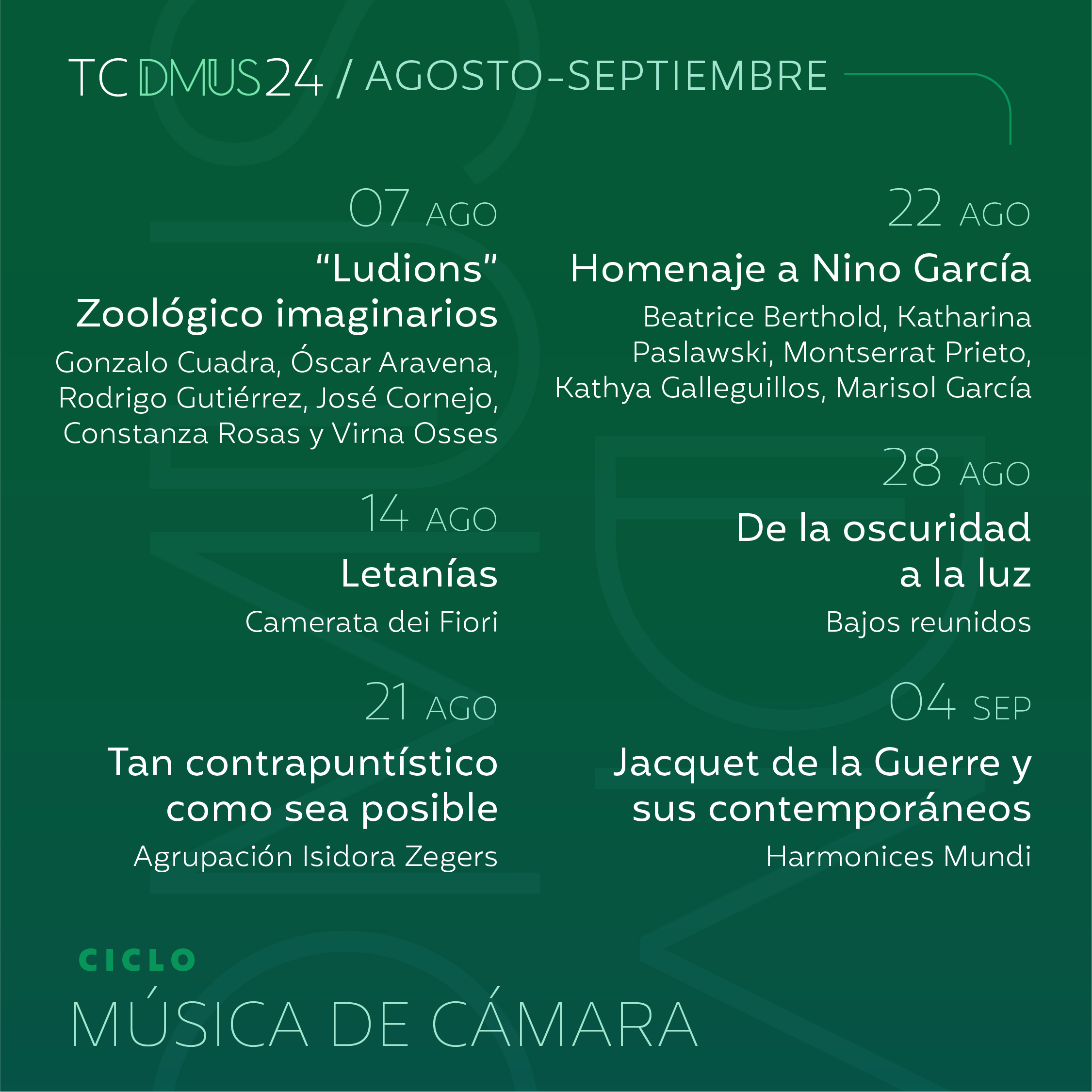 ¡Vuelven los conciertos a la sala Isidora Zegers! Desde el miércoles 7 de agosto comenzará la Temporada de Conciertos 2024 con un ciclo dedicado a la música de cámara.