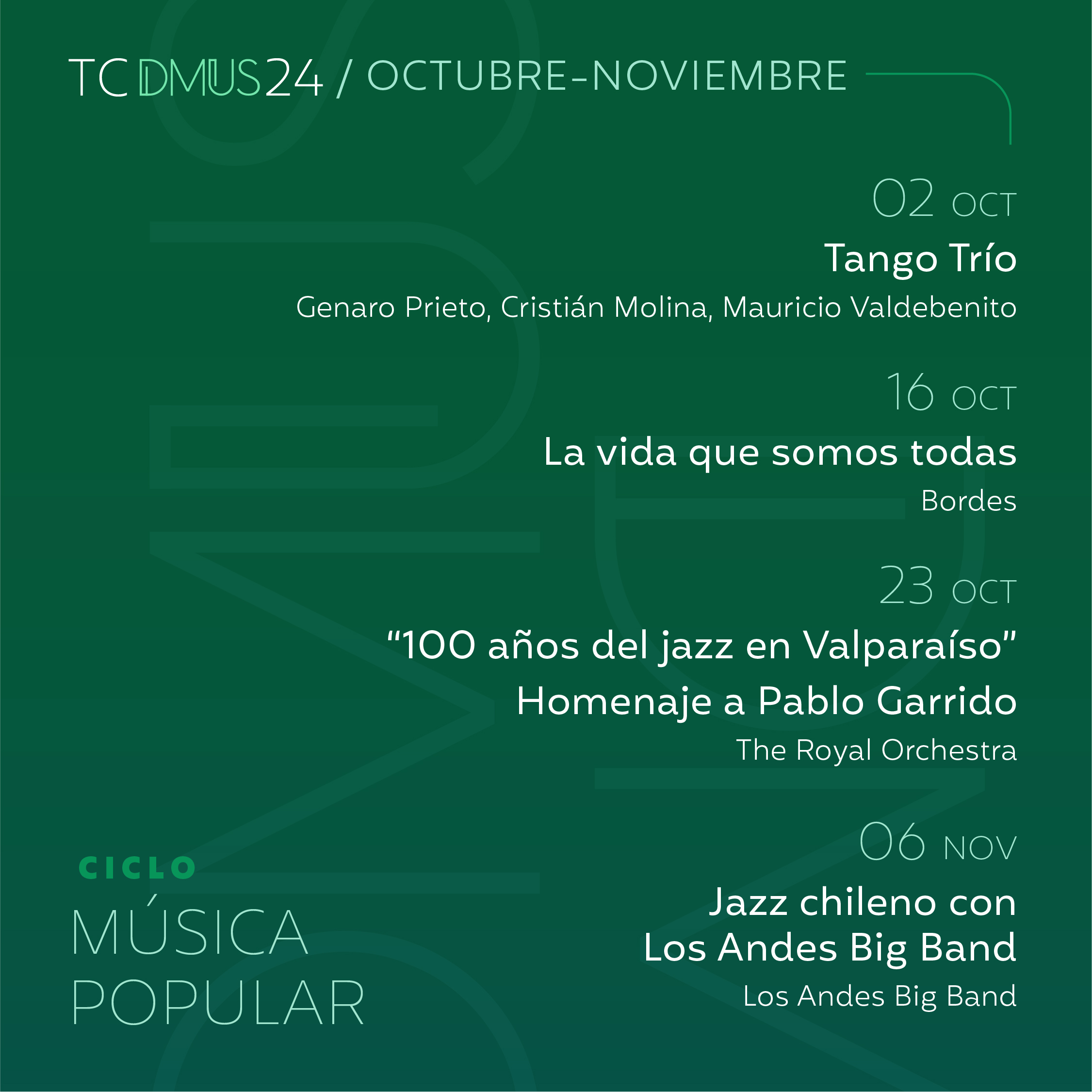 Será un ciclo diverso con cinco presentaciones que incluyen tango, jazz, folclore urbano, y música de raíz latinoamericana. Todo comenzará con el concierto de Tango Trío, agrupación formada por el cantante Genaro Prieto, el bandeonista Cristián Molina y el guitarrista y académico del DMUS, Mauricio Valdebenito (2 de octubre, 19 horas).