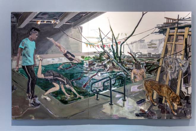 En cuanto a Eliecer Espinoza, el artista y egresado del DAV se encuentra en la Sala de Arte CCU con la obra Inmersión (Pileta II), una pintura de gran formato que explora los tránsitos de las figuras representadas, respecto a la conformación de espacios que entran y salen del soporte pictórico. Protagonizada por una gran piscina atiborrada de objetos, esta pintura presenta espacios arquitectónicos improbables, cuerpos detenidos en pleno punto de desequilibrio, que dan cuenta de un carácter de momentum frente a la gravedad de los escombros y otros materiales residuales.