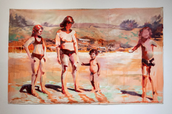 Por otra parte, Ignacio San Martín fue seleccionado con su obra de gran formato (178cm x 290 cm) Verano del 79, pintura óleo sobre tela sin bastidor. “Lo pinté a principios del añon pasado en la escuela. Recibí una foto de mi familia, enviada por una familiar que se fue exiliada hace mucho a Suiza. En la imagen, donde mi madre era pequeña, las figuras y las acciones me parecieron muy ‘pintables’, me inspiraron a capturar ese momento en mi obra”, cuenta Ignacio.