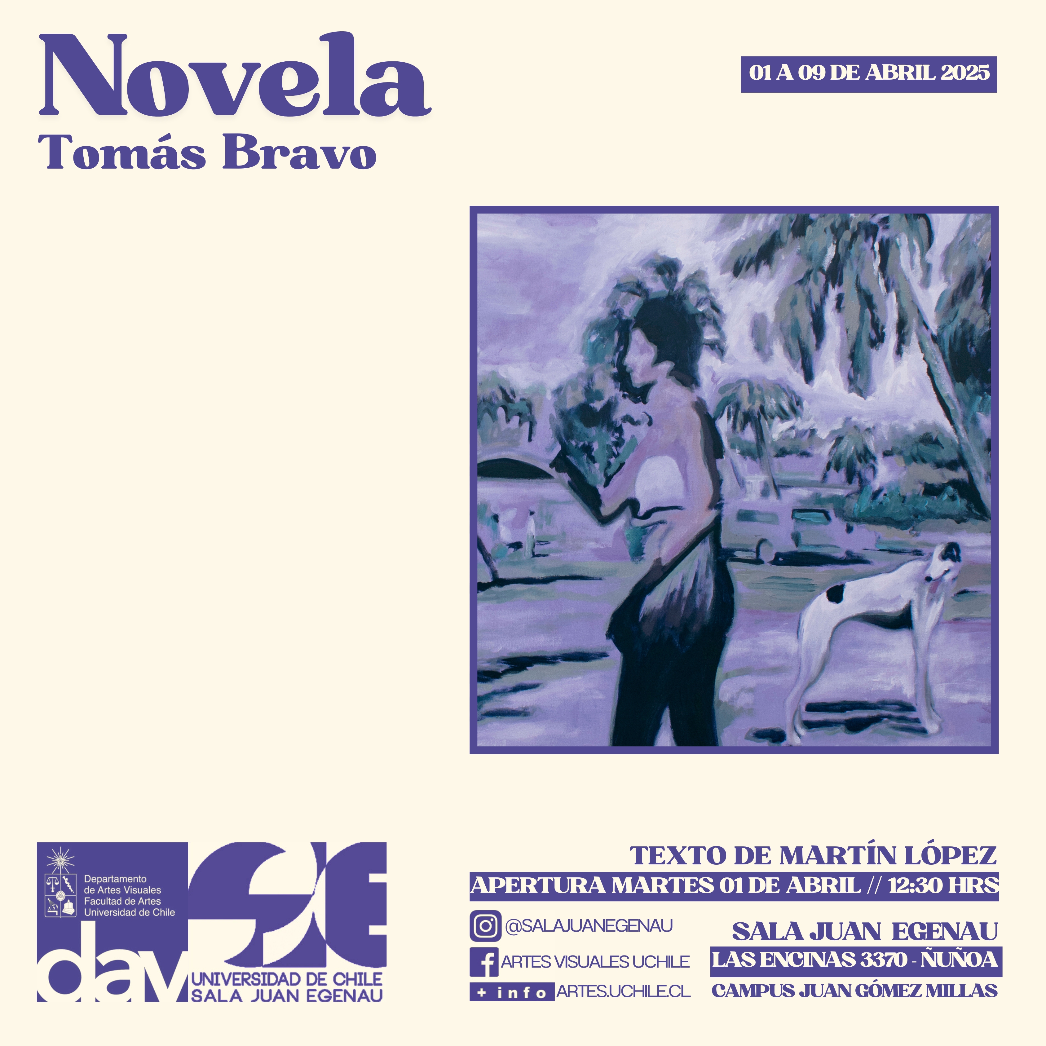 La muestra titulada Novela, está compuesta exclusivamente por pinturas al óleo de mediano y gran formato, incluyendo nueve piezas individuales y un díptico. Según el artista Tomás Bravo Droguett, egresado el 2024 de la carrera de Artes Visuales en la Universidad de Chile y formado como pintor en el taller central de Gonzalo Díaz y Pablo Ferrer, las obras se caracterizan por su "carácter escénico, el uso de paletas reducidas y tonos apastelados, así como una combinación híbrida entre el lenguaje gráfico y el realismo".