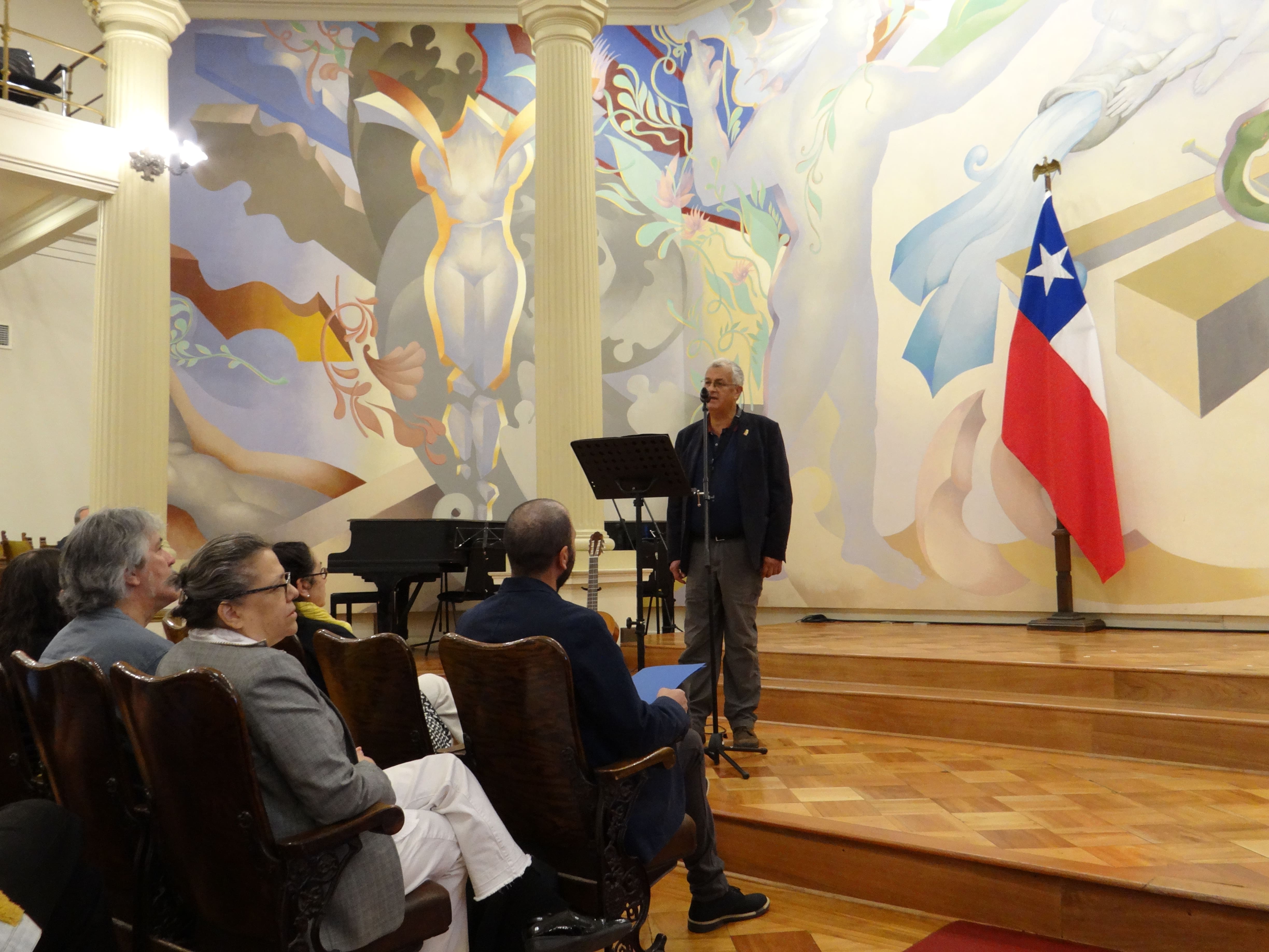 “Este es el término de un gran trabajo y un logro que convoca a la comunidad universitaria de la Facultad de Artes en esta ceremonia”, señaló el Decano Fernando Carrasco, para luego cantar las décimas que preparó especialmente para la ocasión. “Saludo a todos y todas en este importante día, graduación y algarabía / surgen versos, surgen odas. / Siempre es bueno ir creciendo junto al mundo que habitamos / de esta forma nos sumamos a lo que estamos viviendo / nuestra vocación cumpliendo como jóvenes chilenos, que están plenos para entregar lo mejor. / El Postgrado es un honor, siempre, es más, nunca es menos. / Con grandes sueños cumplidos, con gran reconocimiento, este ha sido un fermento por ello han sido elegidos. / Así lo canto y lo cuento, merecen ser aplaudidos”, fueron parte de las décimas que entonó la máxima autoridad de la Facultad de Artes.