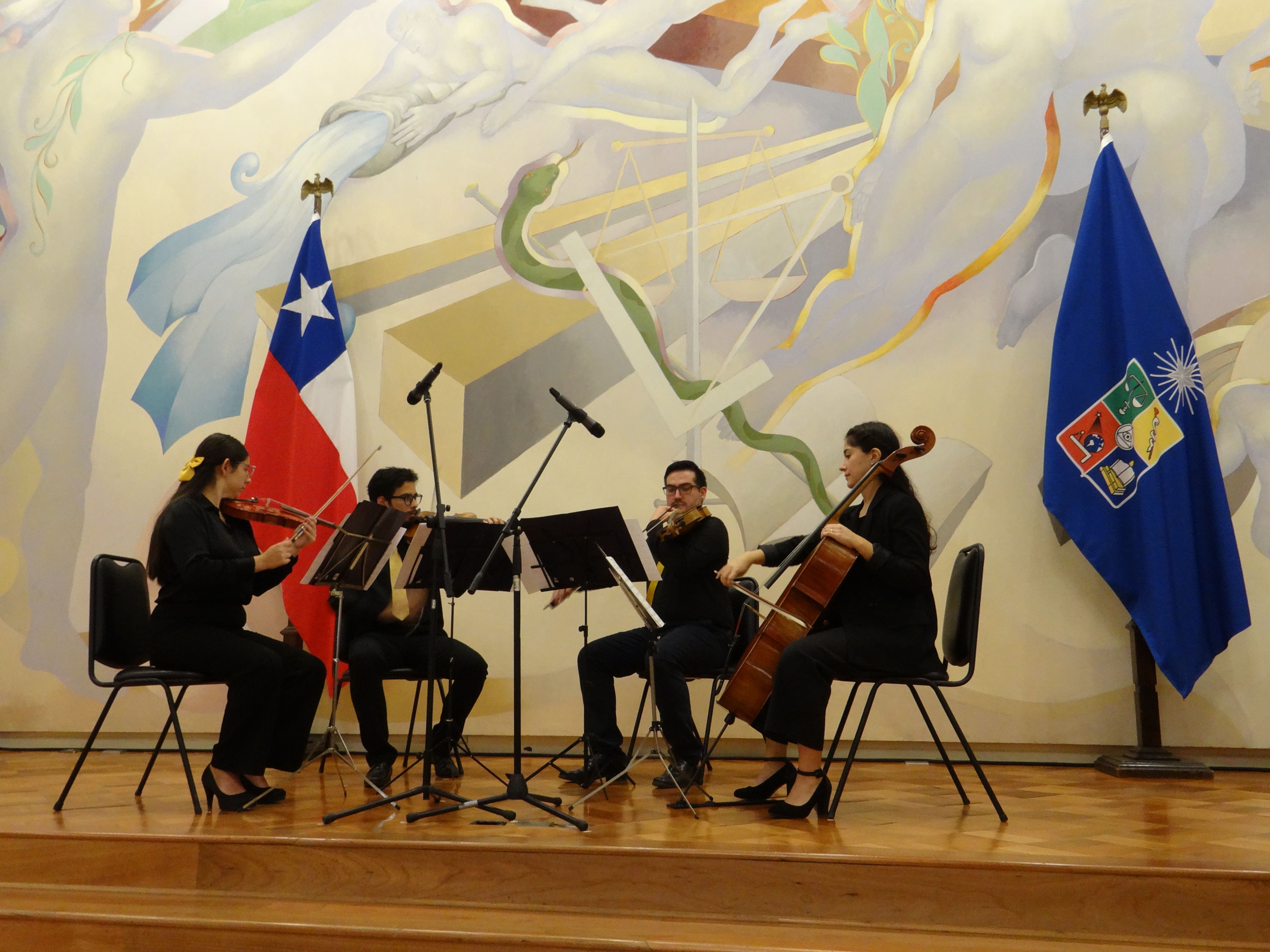 La ceremonia contempló, además, la participación de la intérprete de señas, Bárbara Aránguiz y una intervención musical a cargo del Cuarteto Pacífico Sonoro, integrado por egresados de la Licenciatura Artes con mención en Interpretación Musical, Pamela Soto y Nicolás González (violín), Rodrigo Olivares (viola) y Arelly Araya (violonchelo). A través de la exploración de distintas sonoridades del formato de música de cámara, la agrupación interpretó las piezas Otoño en Buenos Aires y Pan de Azúcar, del compositor mexicano José Elizondo y Brincadeira del compositor brasileño, Heitor Villa-lobos.