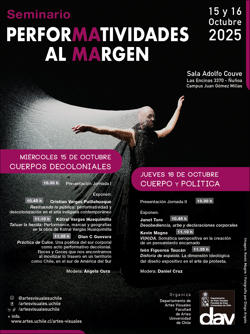 El Seminario Performatividades al margen se realizará durante dos jornadas los días miércoles 15 y jueves 16 de octubre de 2025 a las 10:00 horas en la Sala Adolfo Couve de la Facultad de Artes de la Universidad de Chile, ubicada en Las encinas 3370, Ñuñoa. La entrada es liberada sin previa inscripción.