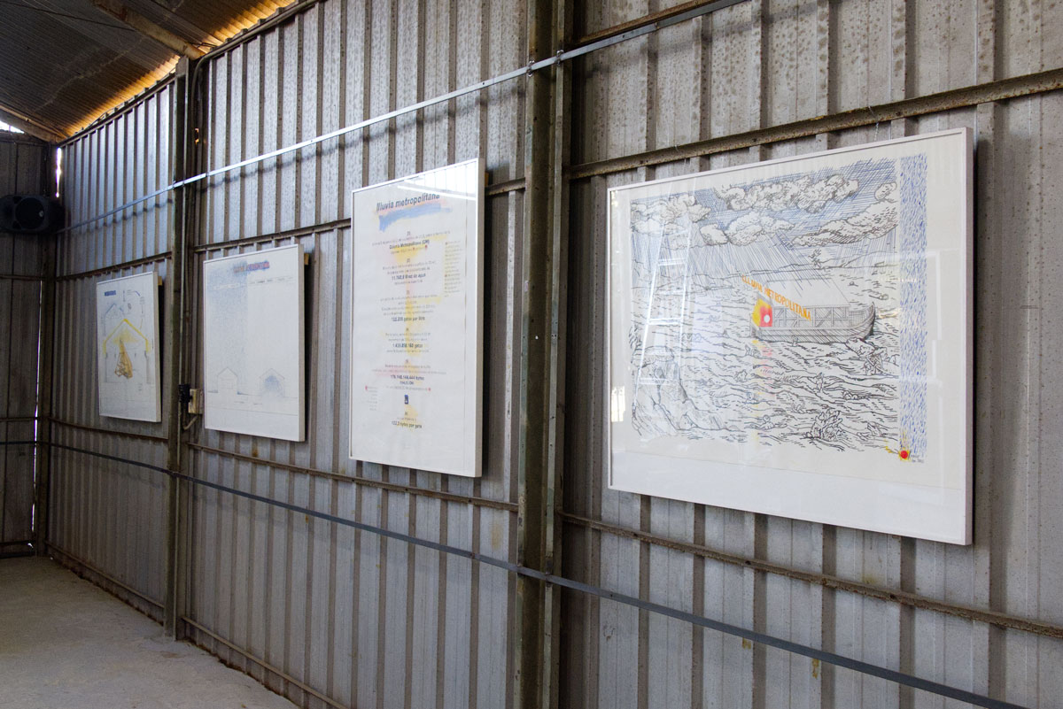 Por su parte, Rainer Krause aporta una dimensión visual a través de dibujos elaborados durante el transcurso del proyecto. El prof. Krause reflexiona sobre la necesidad de estos medios para la planificación y la expansión del pensamiento artístico: "Las postulaciones a fondos concursables exigen eso, los bocetos de montaje. Pero después hay dibujos posteriores que amplían el espectro de todo ese proyecto o el campo de asociación, pensando que abriendo el campo significa que se puede ver de otra forma el trabajo". Sus dibujos proponen una reflexión poética sobre la relación entre el almacenamiento digital de la lluvia y la cantidad matemática de gotas que caben en ese tiempo de registro, además de remitir a tiempos míticos como el diluvio.