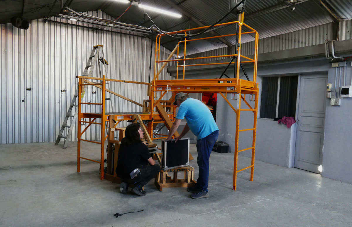 El recorrido por la sala propone una interacción física a través de un andamio reforzado que permite al público ascender hacia el techo. Al respecto, el prof. Krause señala que "ese andamio se transforma también en un trabajo escultórico, porque esa intervención no solamente tenía función netamente para subir cómodamente, sino también da un contraste entre la intervención de material con madera en un andamio de metal". Al subir, el espectador percibe un cambio real en la atmósfera, con diferencias de temperatura que pueden alcanzar los 8 grados respecto al suelo, mientras escucha una fuente sonora situada en la altura que ofrece detalles más nítidos de las gotas. Esta distribución espacial es una respuesta técnica y estética a uno de los problemas fundamentales del arte sonoro: cómo lograr la convivencia de diferentes fuentes en un mismo espacio sin que se confundan, aprovechando que el sonido no posee marcos físicos que lo delimiten.