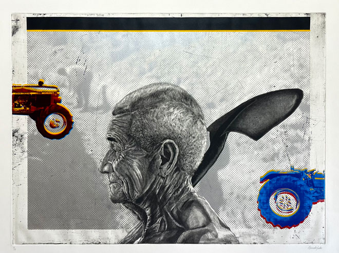El licenciado en Artes con mención en Grabado, Oscar González Galaz, participa con una obra que ya forma parte del acervo del Museo del Grabado en China, tras su paso por el certamen en 2023. Su propuesta, Pala y Piedra XV, es un ejercicio de memoria histórica y técnica.